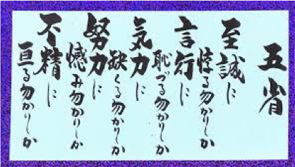 松下校長は、将来海軍将校となる兵学校氏との訓育に意を用い、日々の各自の行為を反省させて明日の修養に備えるため、5か条の反省事項を考え出し、これを日々生徒に実施させました。海上自衛隊になった今も、良き伝統として継承されております。
